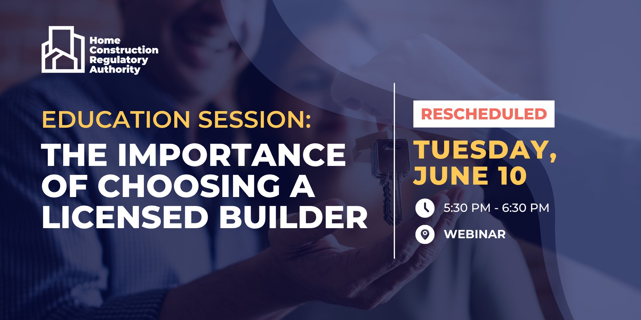 Join the HCRA on June 10 for an online session where we will discuss the risks of working with unlicensed builders and how purchasers can protect themselves throughout the home-buying process. We will also highlight real case examples and how you can protect yourself throughout the home-buying journey.